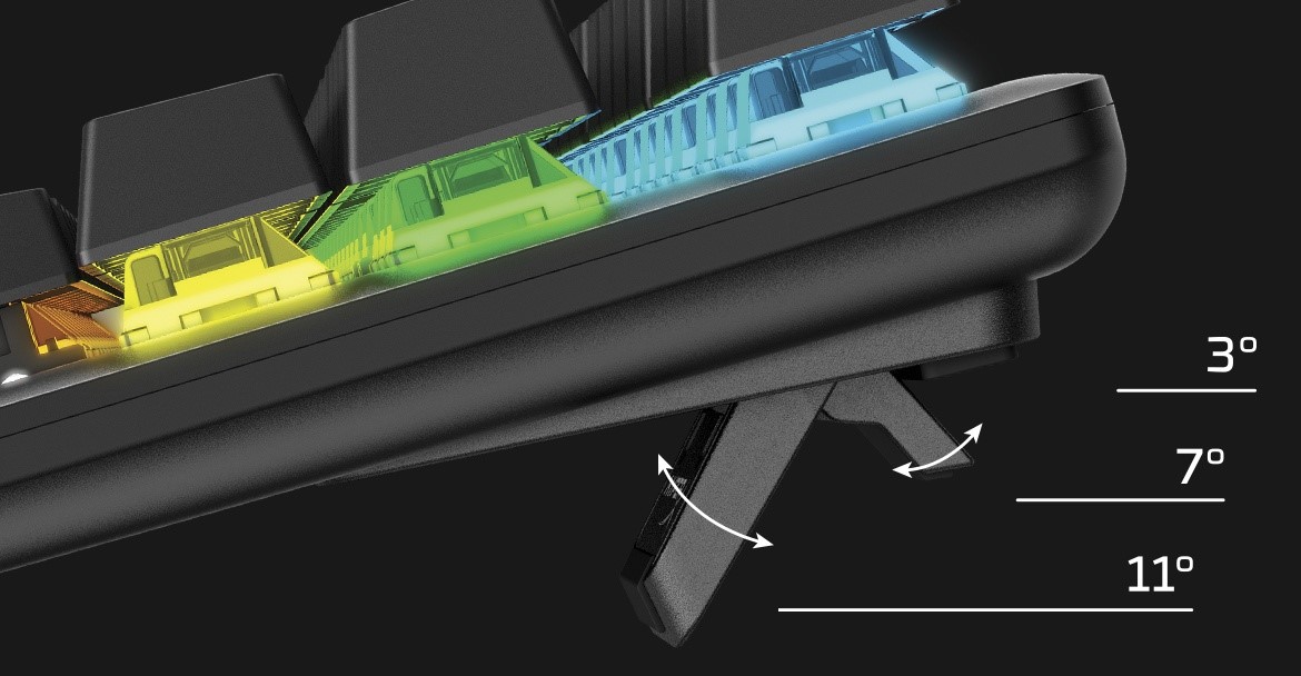 |  | Tùy chỉnh góc nghiêng Điều chỉnh chân bàn phím hai bước cho ba thiết lập góc khác nhau (3°, 7° hoặc 11°), tùy theo góc nghiêng nào giúp cổ tay của bạn thoải mái nhất. |