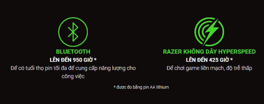 Kết nối nhiều hình thức Khi kết nối bằng Bluetooth, hiệu quả sử dụng năng lượng cực tốt, cho thời lượng pin lên đến 950 giờ. Với kết nối không dây HyperSpeed cho hiệu suất cực nhanh, thời lượng pin cho đến 425 giờ. |
