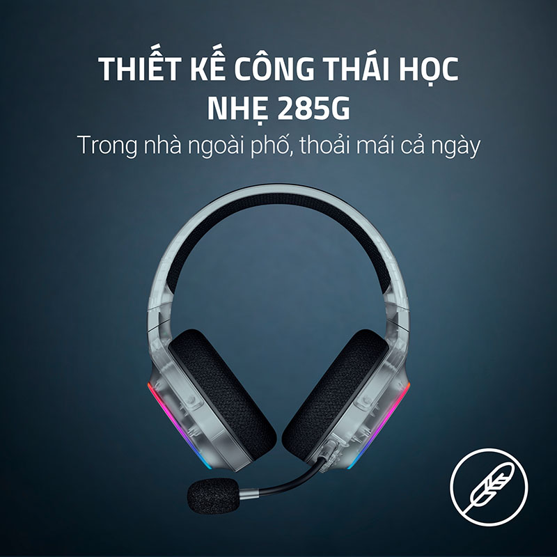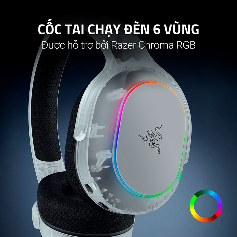 Tai Nghe không dây Razer Barracuda X Chroma Phantom White Edition RZ04-05220400-R3M1 sở hữu thiết kế công thái học ấn tượng với trọng lượng chỉ 285g, mang lại cảm giác nhẹ nhàng và thoải mái trong suốt nhiều giờ sử dụng. Cốc tai với đệm mút hoạt tính bọc vải thoáng khí cùng khả năng xoay linh hoạt giúp ôm trọn tai, đồng thời giảm áp lực hiệu quả. Đặc biệt, phần cốc tai tích hợp 6 vùng đèn Razer Chroma RGB, hỗ trợ 16.8 triệu màu cho hiệu ứng ánh sáng sống động, đồng bộ hoàn hảo với không gian chơi game của bạn.